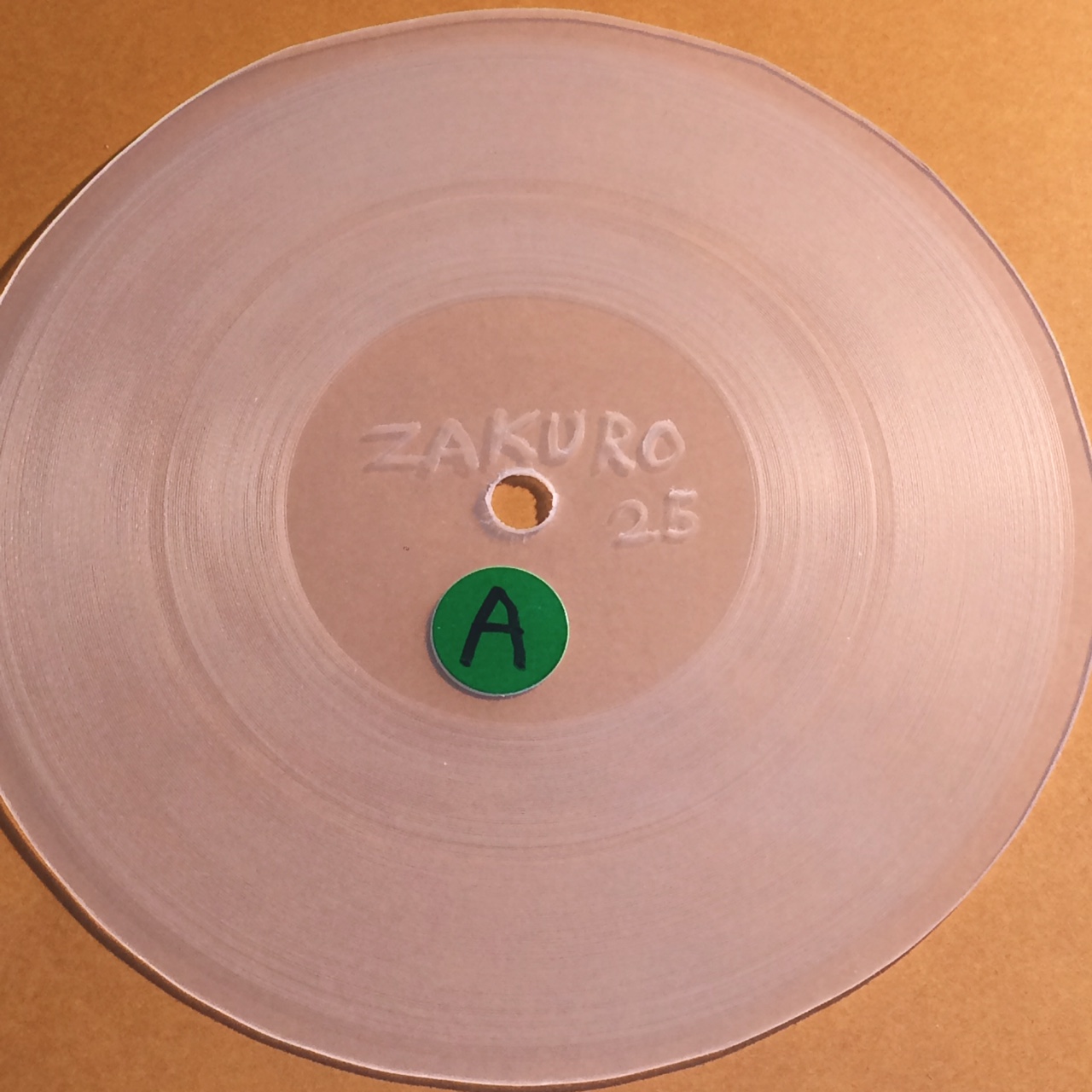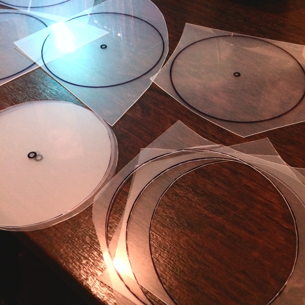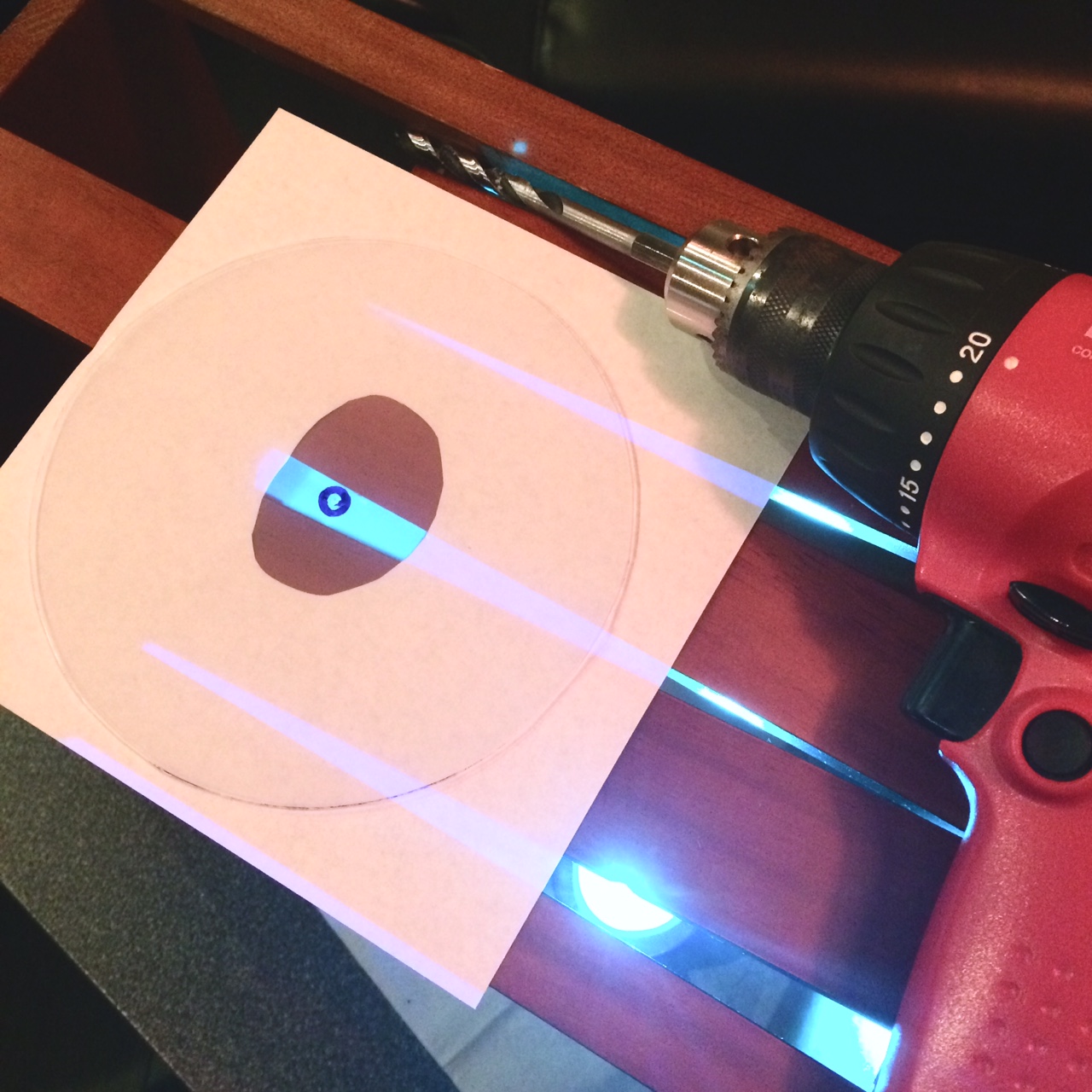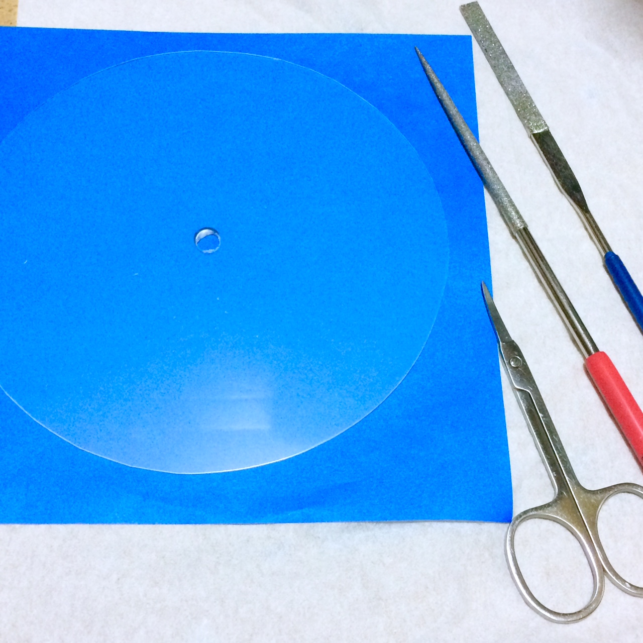 レコードのサイズにカットし、中心にドリルで穴をあけ、